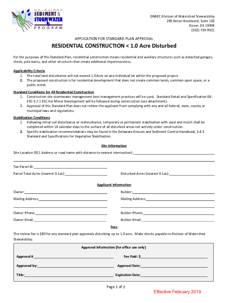 DN REC Division of Watershed Stewardship 285 Baser Boulevard, Suite 102 Dover, DE 19904 (302) 7399921APPLICATION FOR STANDARD PLAN APPROVALRESIDENTIAL CONSTRUCTION 1.0 Acre Disturbed For the purposes