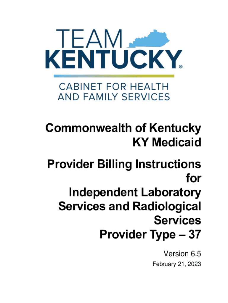 Commonwealth of Kentucky KY Medicaid Provider Billing Instructions for Independent Laboratory Services and Radiological Services Provider Type 37 Version 6.5 February 21, 2023Document Change Log VersionDateNameComments1.010/17/2005HP