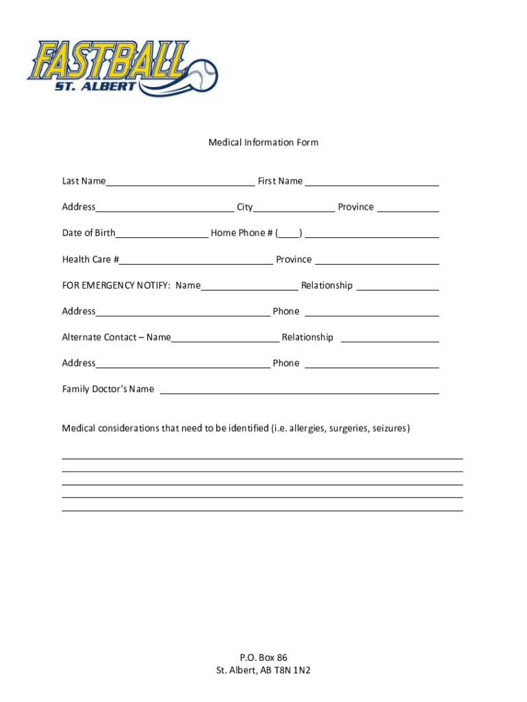 Medical Information Format Name___ First Name ___ Address___ City___ Province ___ Date of Birth___ Home Phone # (___) ___ Health Care #___ Province ___ FOR EMERGENCY NOTIFY: Name___ Relationship ___