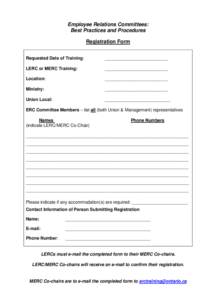Employee Relations Committees: Best Practices and Procedures Registration Form Requested Date of Training:___LRC or MERE Training:___Location:___Ministry:___Union Local:___ERC Committee Members list