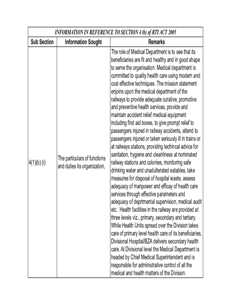 INFORMATION IN REFERENCE TO SECTION 4 (b) of RTI ACT 2005 Sub Section Information Sought Remarks The role of Medical Department is to see that its beneficiaries are fit and healthy and in good shape