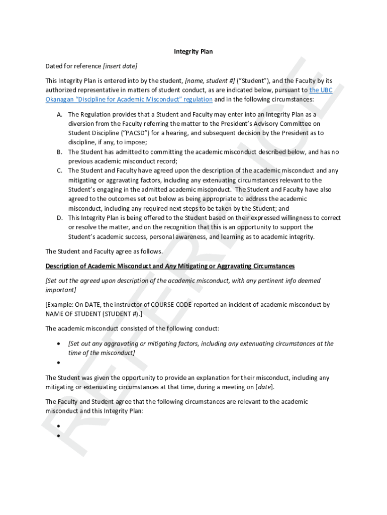 Integrity Plan Dated for reference [insert date]NCE This Integrity Plan is entered into by the student, [name, student #] (Student), and the Faculty by its authorized representative in matters of