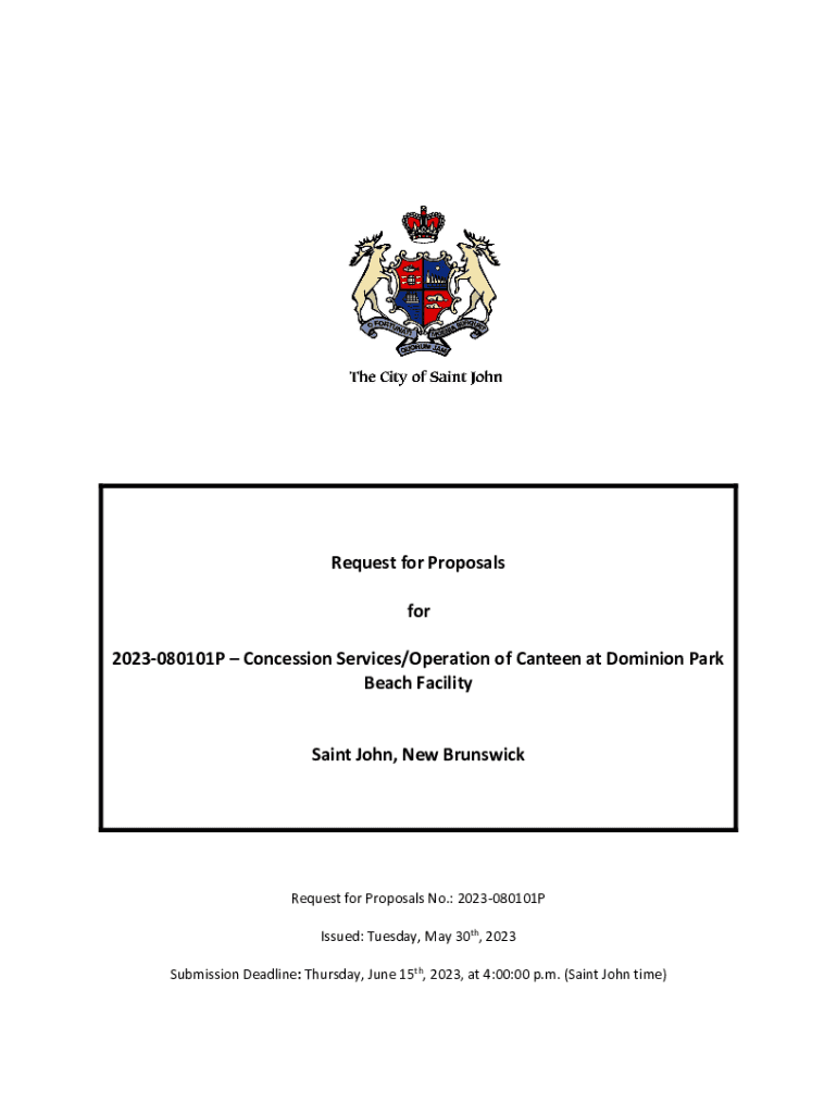 Request for Proposals for 2023080101P Concession Services/Operation of Canteen at Dominion Park Beach Facility Saint John, New BrunswickRequest for Proposals No.: 2023080101P Issued: Tuesday, May