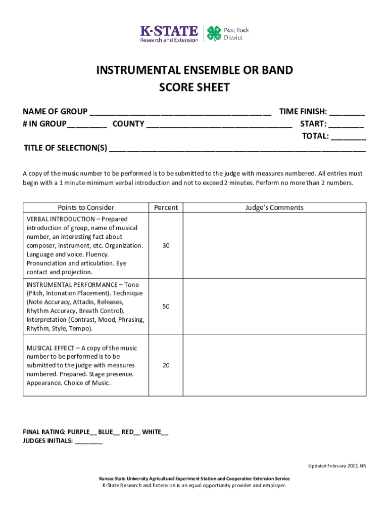 INSTRUMENTAL ENSEMBLE OR BAND Scoresheet NAME OF GROUP ___ TIME FINISH: ___ # IN GROUP___ COUNTY ___ START: ___ TOTAL: ___ TITLE OF SELECTION(S) ___ A copy of the music number to be performed is to