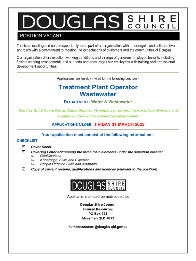 POSITION VACANT This is an exciting and unique opportunity to be part of an organization with an energetic and collaborative approach with a commitment to meeting the expectations of customers and