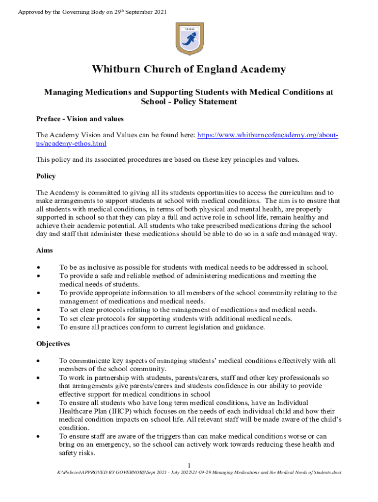 Approved by the Governing Body on 29th September 2021Whitburn Church of England Academy Managing Medications and Supporting Students with Medical Conditions at School Policy Statement Preface Vision