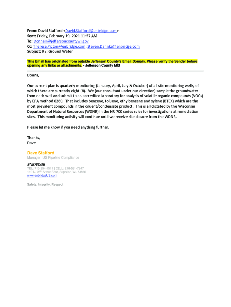 From: David Stafford David.Stafford@enbridge.com Sent: Friday, February 19, 2021 11:57 AM To: DonnaH@jeffersoncountywi.gov Cc: Theresa.Picton@enbridge.com; Steven.Dahnke@enbridge.com Subject: RE: