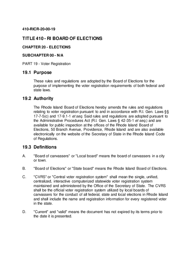 410RICR200019TITLE 410 RI BOARD OF ELECTIONS CHAPTER 20 ELECTIONS SUBCHAPTER 00 N/A PART 19 Voter Registration19.1 Purpose These rules and regulations are adopted by the Board of Elections for the