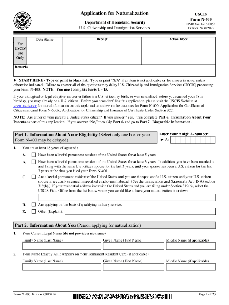 Application for NaturalizationUSCIS Form N400Department of Homeland Security U.S. Citizenship and Immigration Services Date StampReceiptOMB No. 16150052 Expires 09/30/2022 Action Blocker USCIS Use