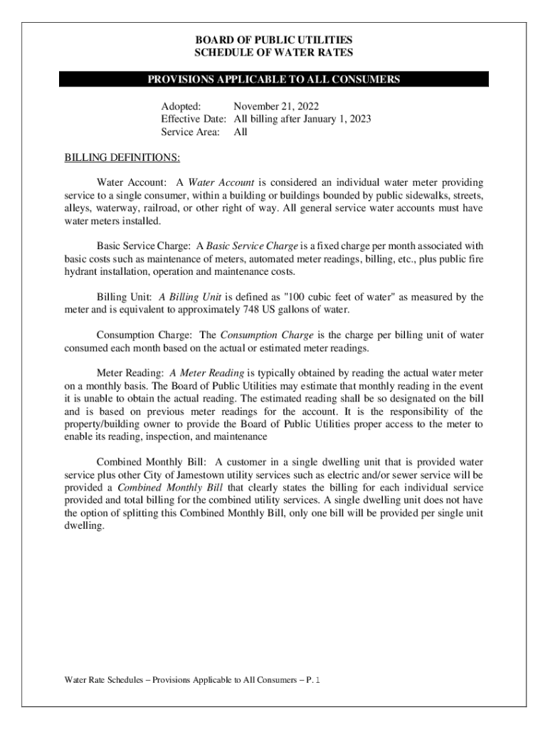 BOARD OF PUBLIC UTILITIES SCHEDULE OF WATER RATES PROVISIONS APPLICABLE TO ALL CONSUMERS Adopted: November 21, 2022, Effective Date: All billing after January 1, 2023, Service Area: All BILLING DEFINITIONS: