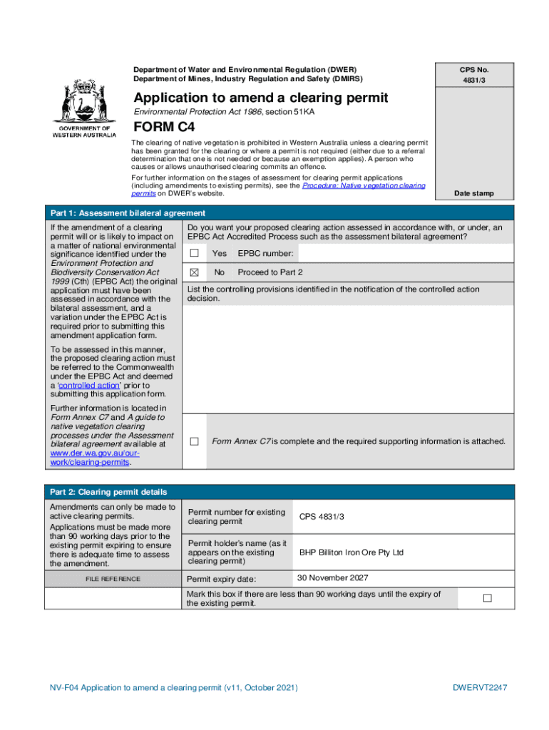 Department of Water and Environmental Regulation (DEER) Department of Mines, Industry Regulation and Safety (EMIRS)CPS No. 4831/3Application to amend a clearing permit Environmental Protection Act