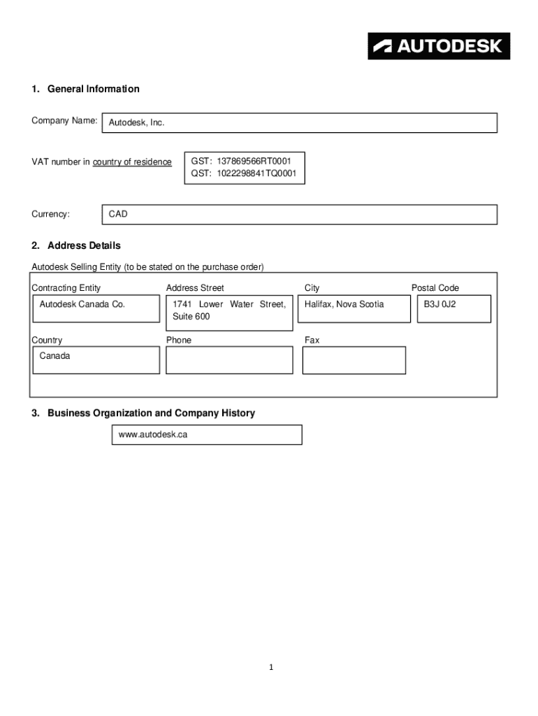 1. General Information Company Name:Autodesk, Inc.GST: 137869566RT0001 ST: 1022298841TQ0001VAT number in country of residenceCurrency:CAD2. Address Details Autodesk Selling Entity (to be stated on