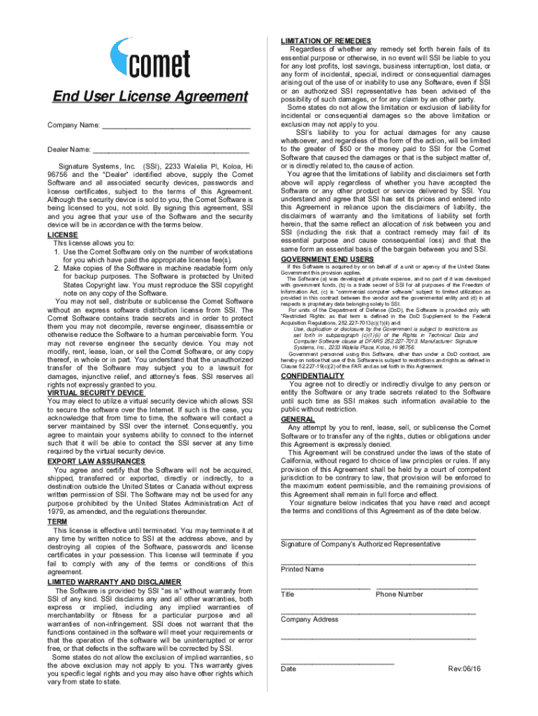 End User License Agreement Company Name: ___ Dealer Name: ___ Signature Systems, Inc. (SSI), 2233 Amelia Pl, Kola, Hi 96756 and the Dealer identified above, supply the Comet Software and all associated