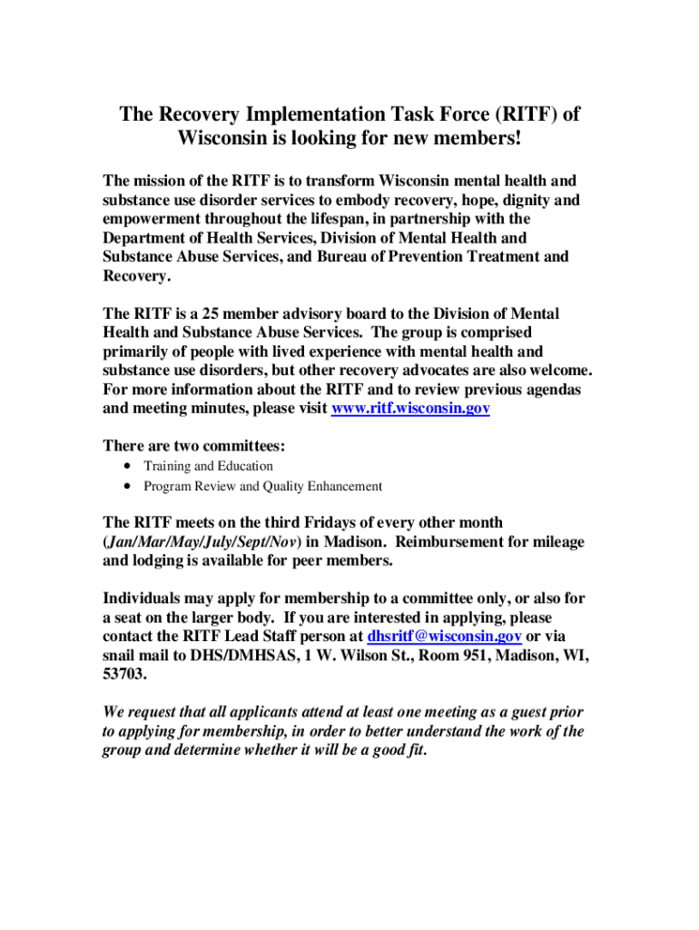 The Recovery Implementation Task Force (RIFF) of Wisconsin is looking for new members! The mission of the RIFF is to transform Wisconsin mental health and substance use disorder services to embody