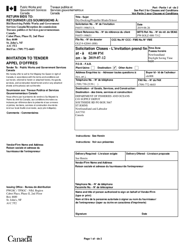 Part Parties 1 of DE 2 See Part 2 for Clauses and Conditions Void Parties 2 pour Clauses et Conditions1 1RETURN BIDS TO: RETURNER LES COMMISSIONS :Title Outbid Receiving Public Works and Government
