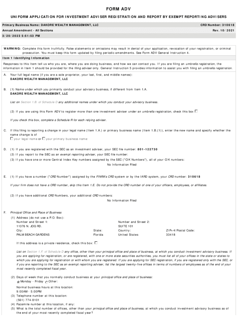 FORM ADV UNIFORM APPLICATION FOR INVESTMENT ADVISER REGISTRATION AND REPORT BY EXEMPT REPORTING ADVISERS Primary Business Name: DAKOTA WEALTH MANAGEMENT, LLC CRD Number: 310618Annual Amendment All
