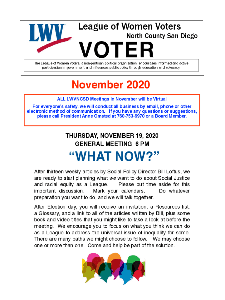 League of Women Voters North County San DiegoVOTERThe League of Women Voters, a nonpartisan political organization, encourages informed and active