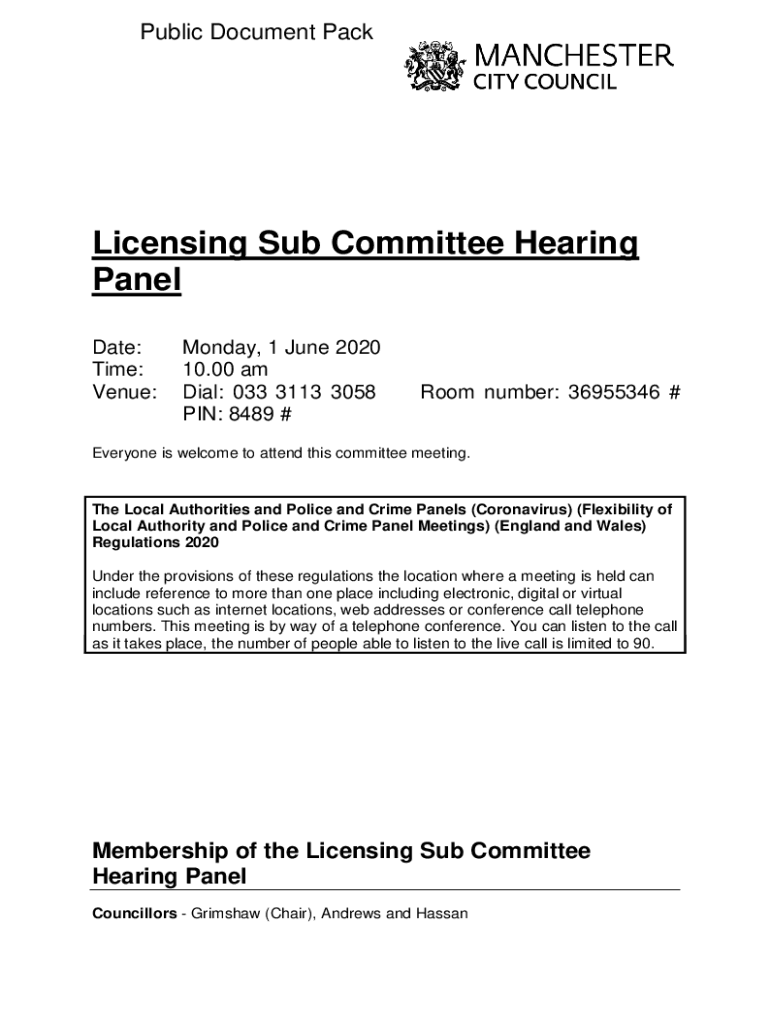 Public Document PackLicensing Sub Committee Hearing Panel Date: Time: Venue:Monday, 1 June 2020 10.00 am Dial: 033 3113 3058 PIN: 8489 #Room number: 36955346 #Everyone is welcome to attend this committee