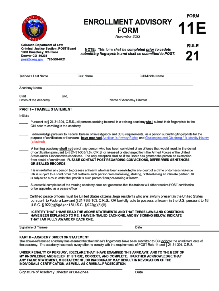 ENROLLMENT ADVISORY FORM November 2022Colorado Department of Law Criminal Justice Section, POST Board 1300 Broadway, 9th Floor Denver CO 80203 post@coag.gov 7205086721FORM11ENOTE: This form shall