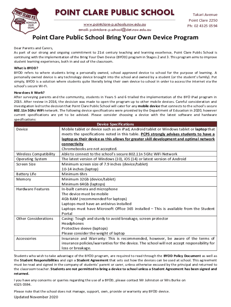 POINT CLARE PUBLIC SCHOOL www.pointclarep.schools.nsw.edu.au email: pointclarep.school@det.nsw.edu.auTakari Avenue Point Clare 2250 pH: 02 4325 0594Point Clare Public School Bring Your Own Device