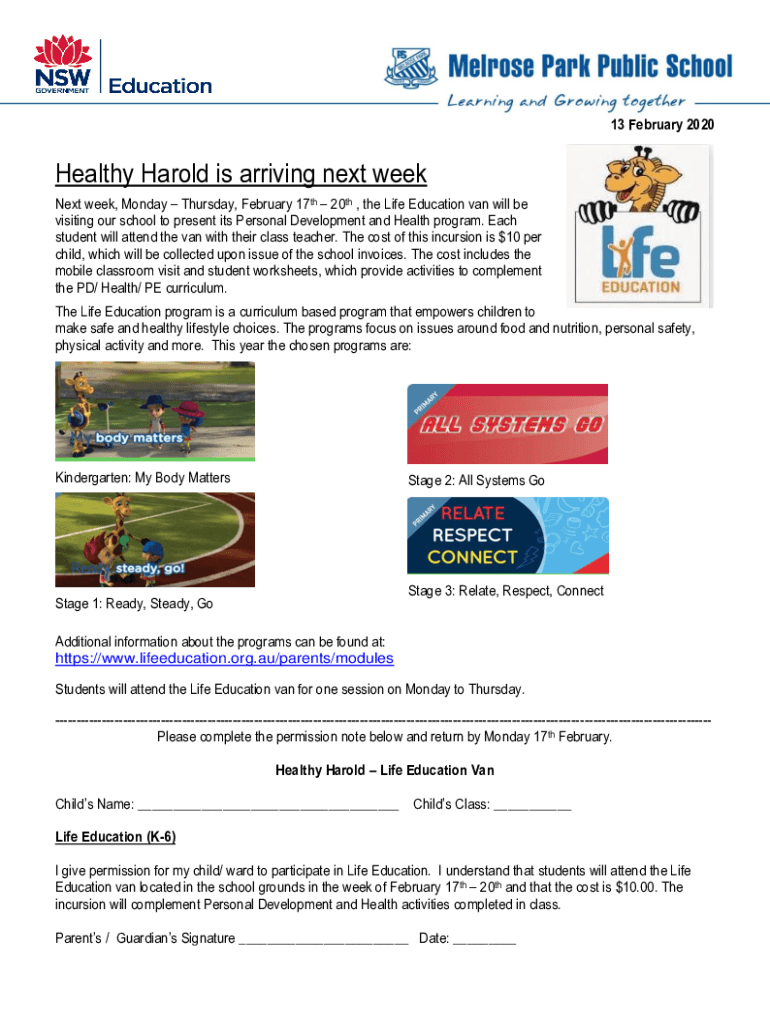 13 February 2020Healthy Harold is arriving next week, Monday Thursday, February 17th 20th, the Life Education van will be visiting our school to present its Personal Development and Health program.