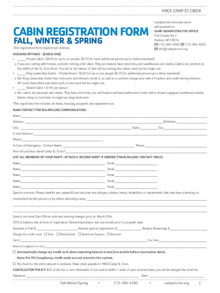 YMCA CAMP ST CROIX Complete this form and return with payment to: CAMP ADMINISTRATIVE OFFICE 532 County Rd. F Hudson, WI 54016 (P) 7153864380 (F) 7153864382 (E) info@campstcroix.orgCABIN REGISTRATION