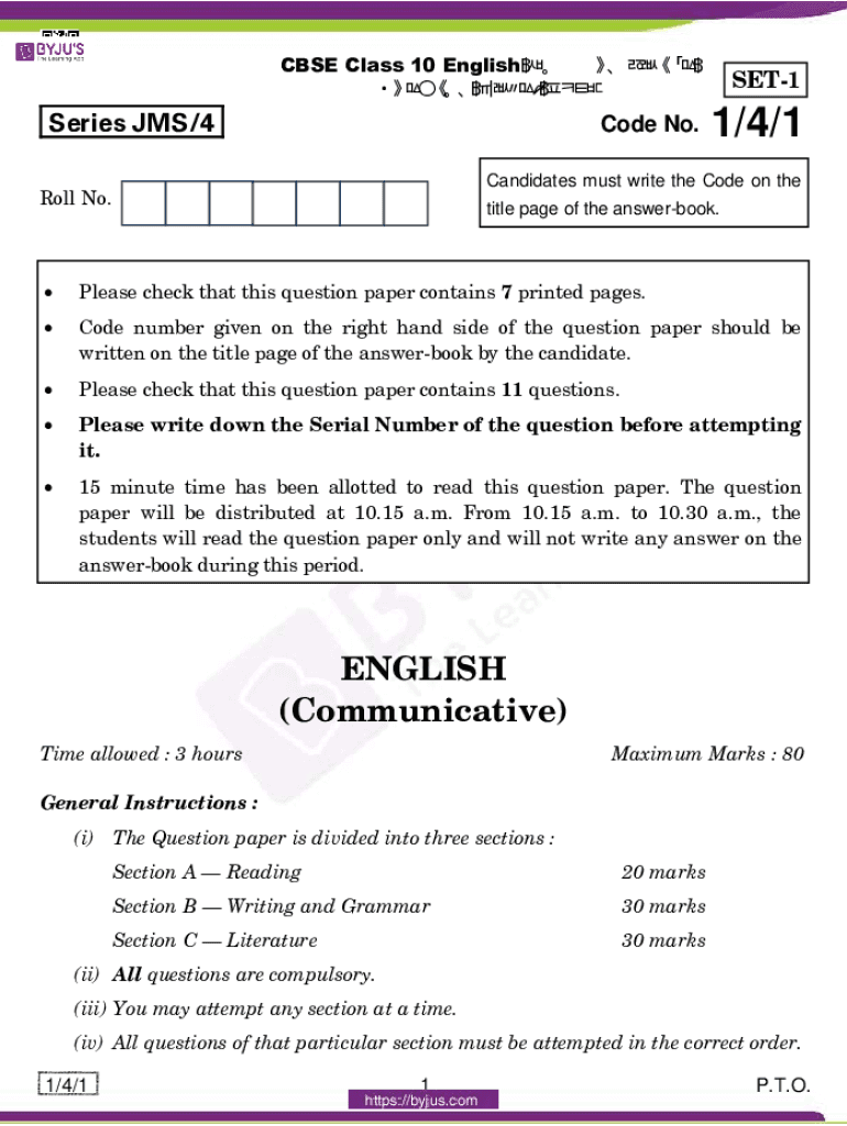 CBSE Class 10 English&RPPXQLFDWLYH 4XHVWLRQ3DSHUSET1Code No.1/4/1Series JMS/4Candidates must write the Code on thermal No. Title page of the answer book. Please check that this question paper contains