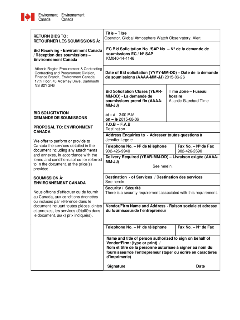 RETURN BIDS TO: RETURNER LES COMMISSIONS : Bid Receiving Environment Canada / Reception DES sou missions Environment Canaanite Title Operator, Global Atmosphere Watch Observatory, Alert EC Bid Solicitation