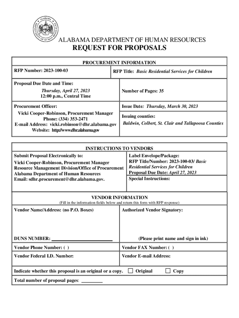 ALABAMA DEPARTMENT OF HUMAN RESOURCESREQUEST FOR PROPOSALS PROCUREMENT INFORMATION RFP Number: 202310003RFP Title: Basic Residential Services for ChildrenProposal Due Date and Time: Thursday, April