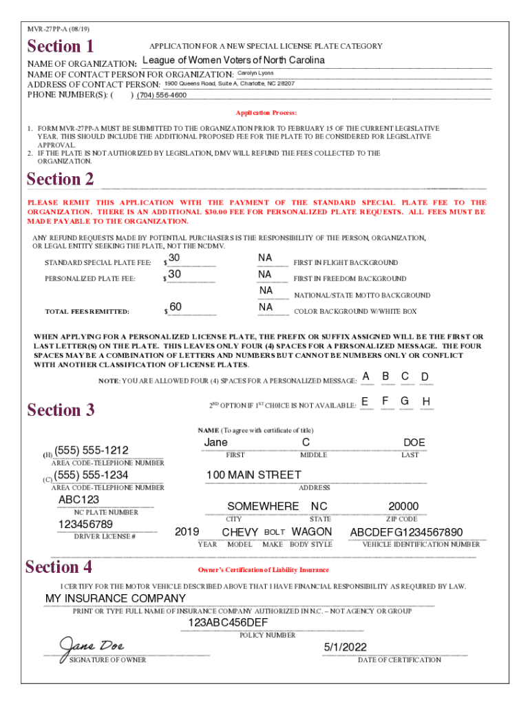 MVR27PPA (08/19)Section 1APPLICATION FOR A NEW SPECIAL LICENSE PLATE CATEGORYNAME OF ORGANIZATION: ___ NAME OF CONTACT PERSON FOR ORGANIZATION: ___ ADDRESS OF CONTACT PERSON: ___ PHONE NUMBER(S):