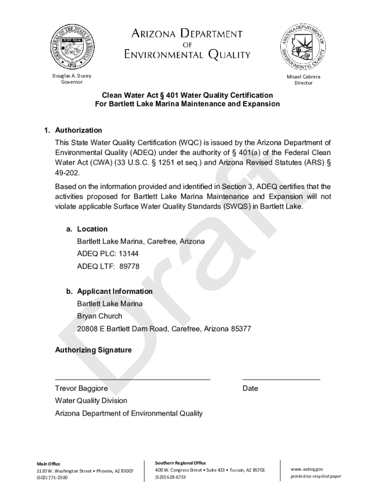 Douglas A. Ducey GovernorMisael Cabrera DirectorClean Water Act 401 Water Quality Certification For Bartlett Lake Marina Maintenance and Expansion 1. Authorization This State Water Quality Certification