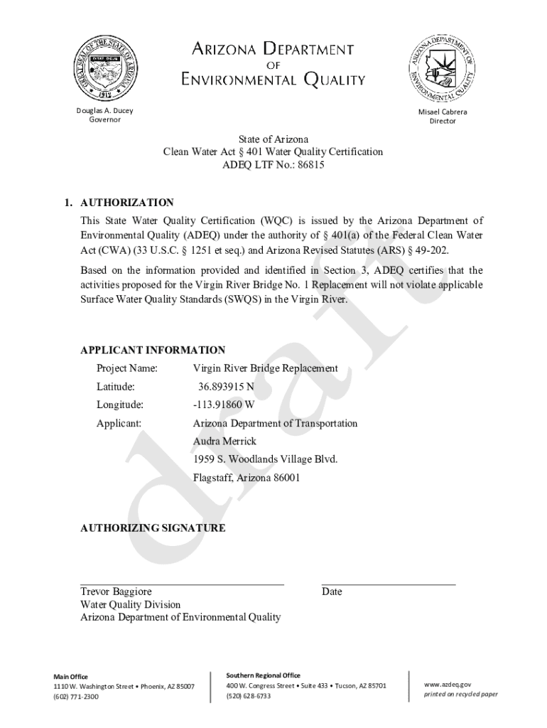 Douglas A. Ducey GovernorMisael Cabrera Directorate of Arizona Clean Water Act 401 Water Quality Certification ADEN LTF No.: 86815 1. AUTHORIZATION This State Water Quality Certification (QC) is issued