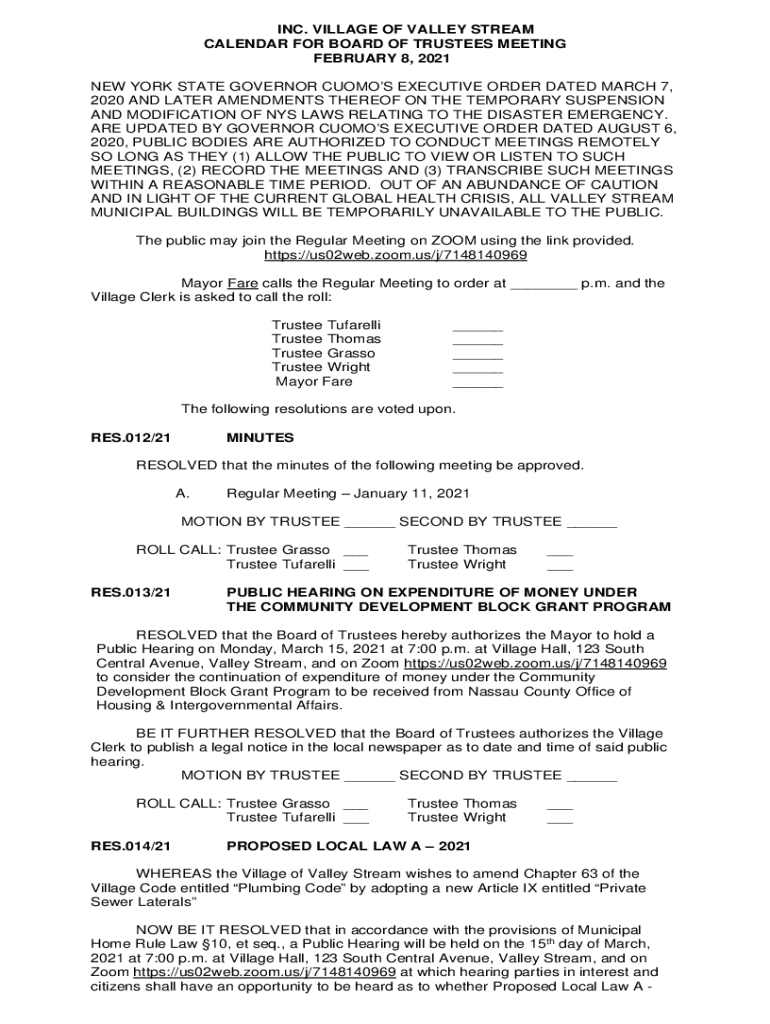 INC. VILLAGE OF VALLEY STREAM CALENDAR FOR BOARD OF TRUSTEES MEETING FEBRUARY 8, 2021, NEW YORK STATE GOVERNOR CUO MOS EXECUTIVE ORDER DATED MARCH 7, 2020, AND LATER AMENDMENTS THEREOF ON THE TEMPORARY
