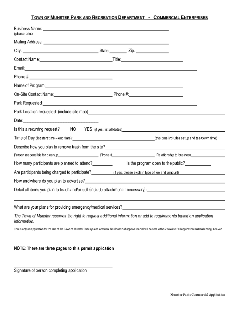 TOWN OF MUNSTER PARK AND RECREATION DEPARTMENT COMMERCIAL ENTERPRISES Business Name: (please print)Mailing Address: City:State:Contact Name:Zip: Title:Email: Phone #: Name of Program: Onsite Contact