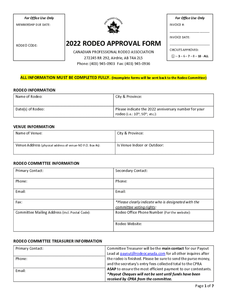 For Office Use Only Office Use OnlyMEMBERSHIP DUE DATE:INVOICE #: ___ INVOICE DATE:RODEO CODE:2022 RODEO APPROVAL FORM CANADIAN PROFESSIONAL RODEO ASSOCIATION 272245 RR 292, Airdrie, AB T4A 2L5 Phone: