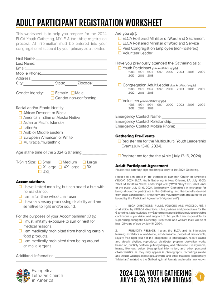 ADULT PARTICIPANT REGISTRATION WORKSHEET This worksheet is to help you prepare for the 2024 ELLA Youth Gathering, MALE & the table registration process. All information must be entered into your congregational