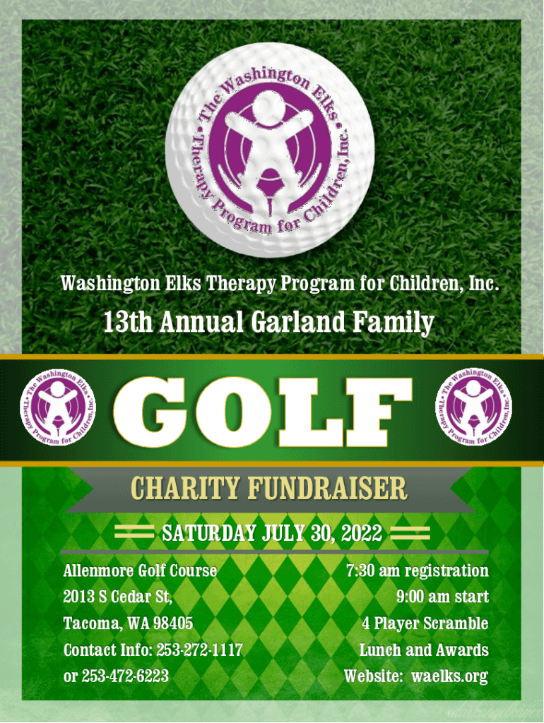 Washington Elks Therapy Program for Children, Inc.13th Annual Garland Familiarity FUNDRAISER SATURDAY, JULY 30, 2022, Allen more Golf Course 2013 S Cedar St, Tacoma, WA 98405 Contact Info: 2532721117