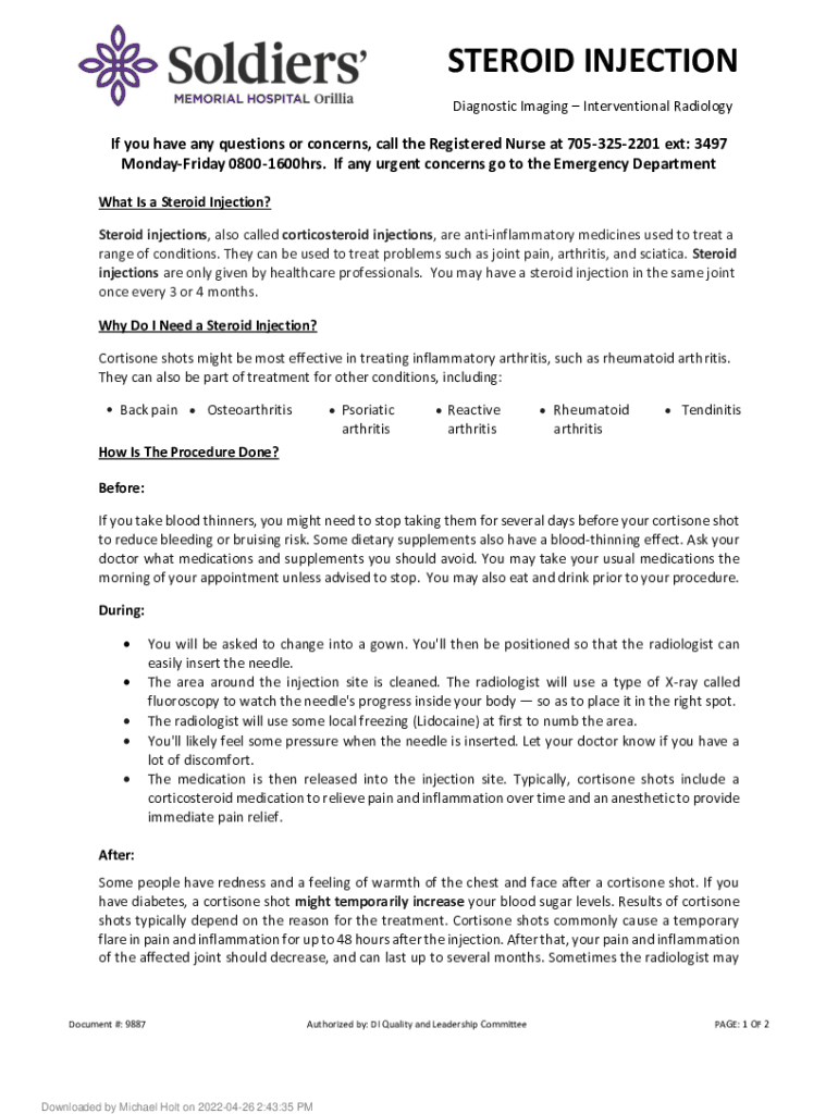 STEROID INJECTION Diagnostic Imaging Interventional Radiology you have any questions or concerns, call the Registered Nurse at 7053252201 ext: 3497 Monday Friday 08001600hrs. If any urgent concerns