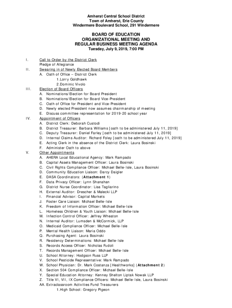Amherst Central School District Town of Amherst, Erie County Winder mere Boulevard School, 291 WindermereBOARD OF EDUCATION ORGANIZATIONAL MEETING AND REGULAR BUSINESS MEETING AGENDA Tuesday, July