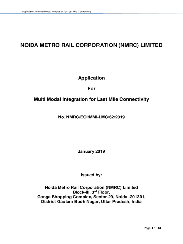 Application for Multi Modal Integration for Last Mile ConnectivityNOIDA METRO RAIL CORPORATION (NMR) LIMITEDApplication For Multi Modal Integration for Last Mile Connectivity No. NMR/EOI/MMI LMC/62/2019January