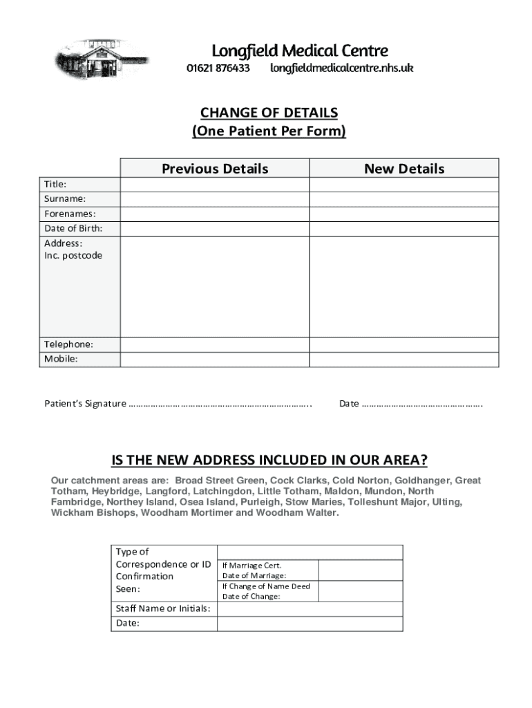 CHANGE OF DETAILS (One Patient Per Form) Previous Details DetailsTitle: Surname: Forenames: Date of Birth: Address: Inc. postcodeTelephone: Mobile:Patients Signature. Date.IS THE NEW ADDRESS INCLUDED