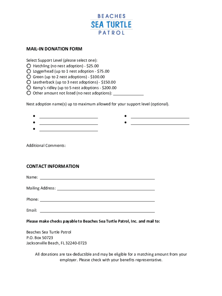 MAILING DONATION FORM Select Support Level (please select one): Hatchling (no nest adoption) $25.00 Loggerhead (up to 1 nest adoption $75.00 Green (up to 2 nest adoptions) $100.00 Leather back (up