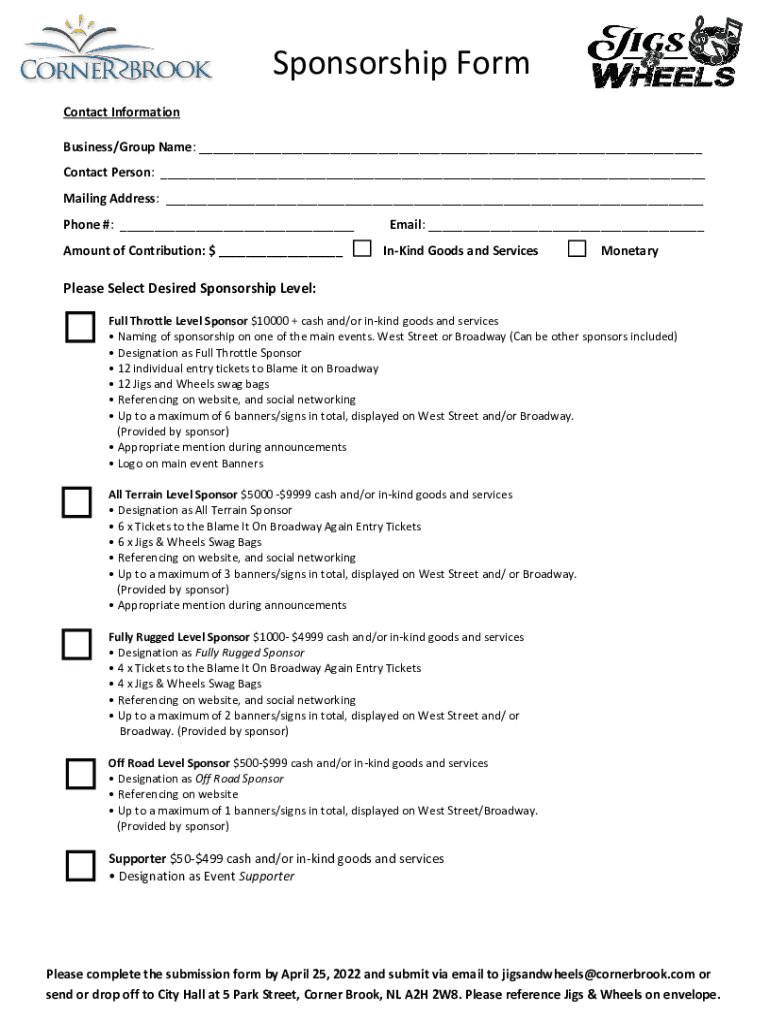 Sponsorship Form Contact Information Business/Group Name: ___ Contact Person: ___ Mailing Address: ___ Phone #: ___ Amount of Contribution: $ ___Email: ___ Inking Goods and ServicesMonetaryPlease