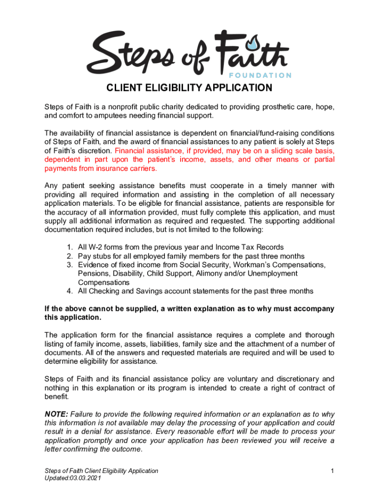 CLIENT ELIGIBILITY APPLICATION Steps of Faith is a nonprofit public charity dedicated to providing prosthetic care, hope, and comfort to amputees needing financial support. The availability of financial
