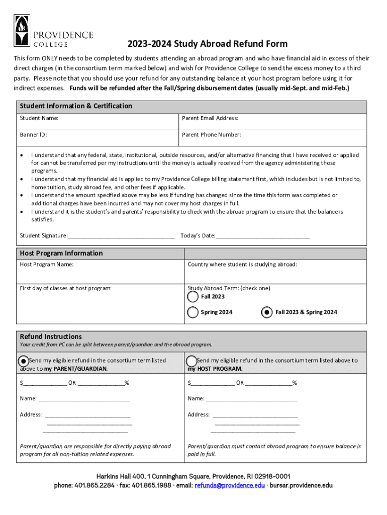 20232024 Study Abroad Refund Form This form ONLY needs to be completed by students attending an abroad program and who have financial aid in excess of their direct charges (in the consortium term