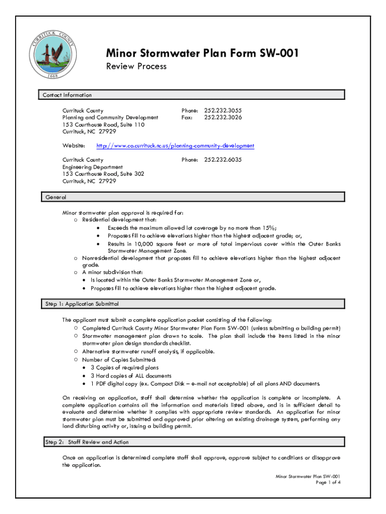 Minor Stormwater Plan Form SW001 Review Process Contact Information Curricula County Planning and Community Development 153 Courthouse Road, Suite 110 Curricula, NC 27929 Website:Phone: Fax:252.232.3055