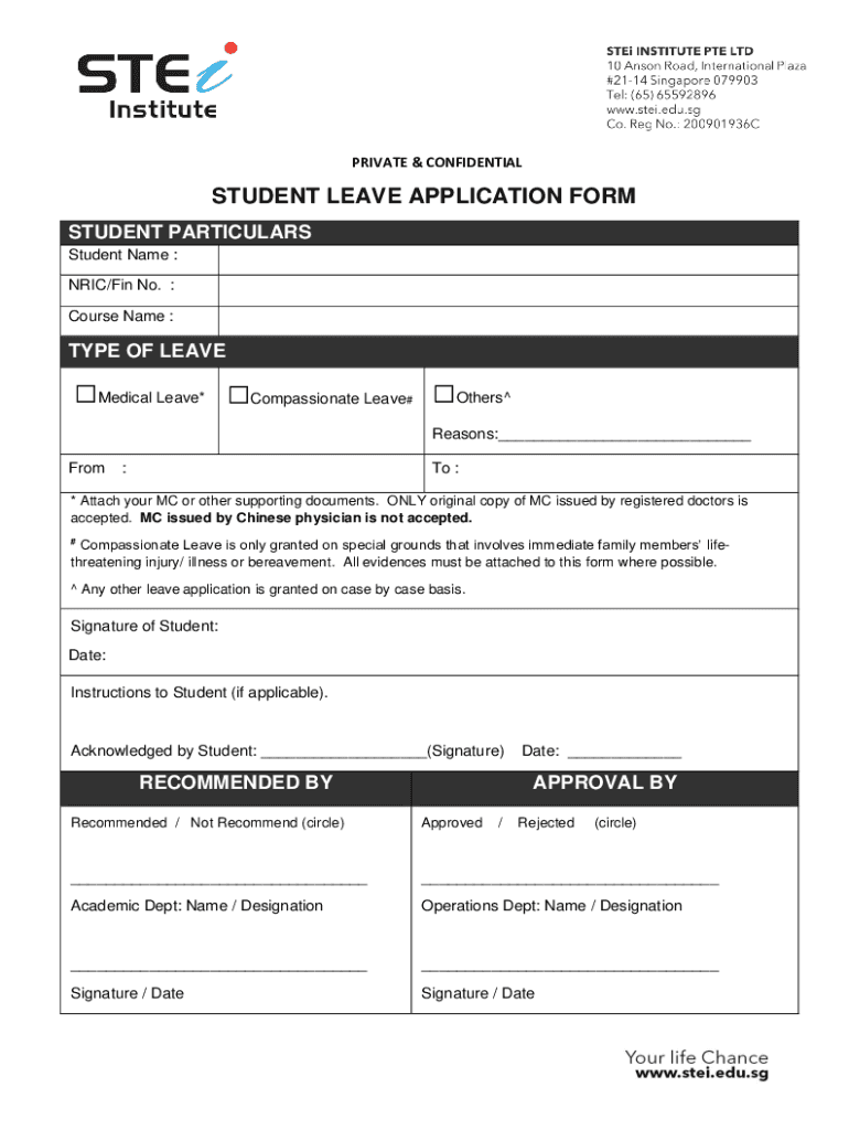 PRIVATE & CONFIDENTIALSTUDENT LEAVE APPLICATION FORM STUDENT PARTICULARS Student Name : ERIC/Fin No. Course Name :TYPE OF LEAVEMedical Leave×Compassionate Leave#Others^Reasons:___ From:To :* Attach