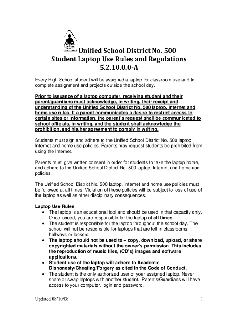UnifiedSchoolDistrictNo.500 StudentLaptopUseRulesandRegulations 5.2.10.0.0A Every High School student will be assigned a laptop for classroom use and to complete assignment and projects outside the