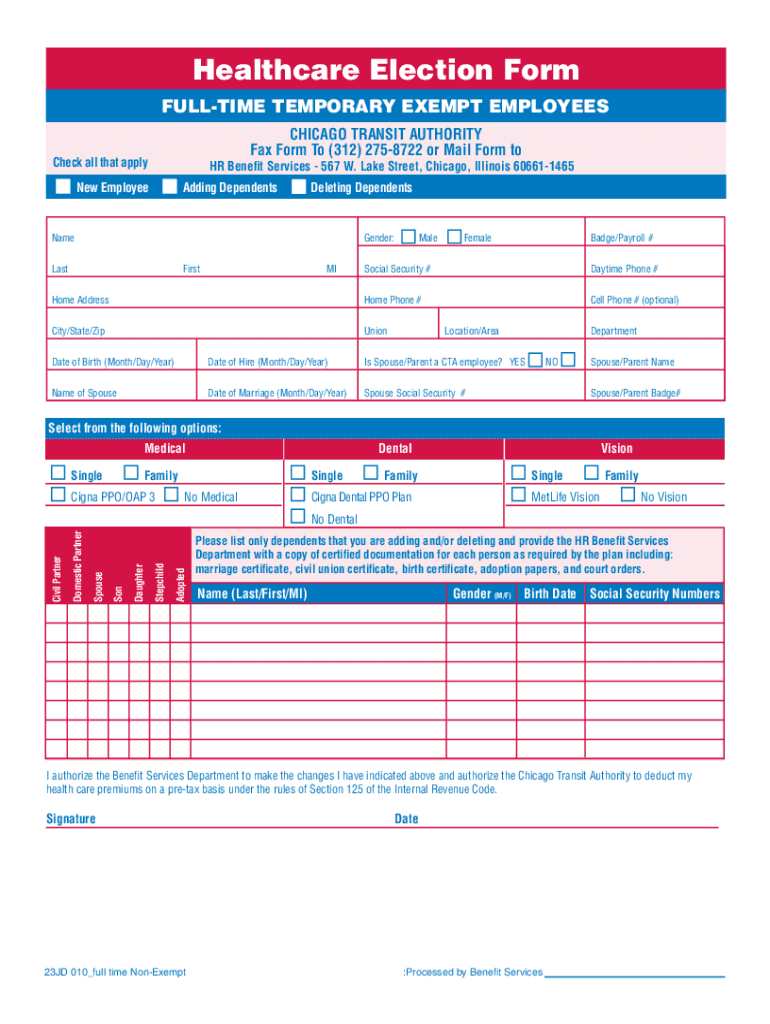 Healthcare Election Form FULL TIME TEMPORARY EXEMPT EMPLOYEES CHICAGO TRANSIT AUTHORITY Fax Form To (312) 2758722 or Mail Form check all that apply HR Benefit Services 567 W. Lake Street, Chicago,