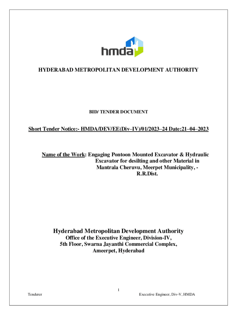 HYDERABAD METROPOLITAN DEVELOPMENT AUTHORITY BID/ TENDER DOCUMENT Short Tender Notice: HMD/DEV/EE(Div IV)/01/202324 Date:21042023Name of the Work: Engaging Pontoon Mounted Excavator & Hydraulic Excavator